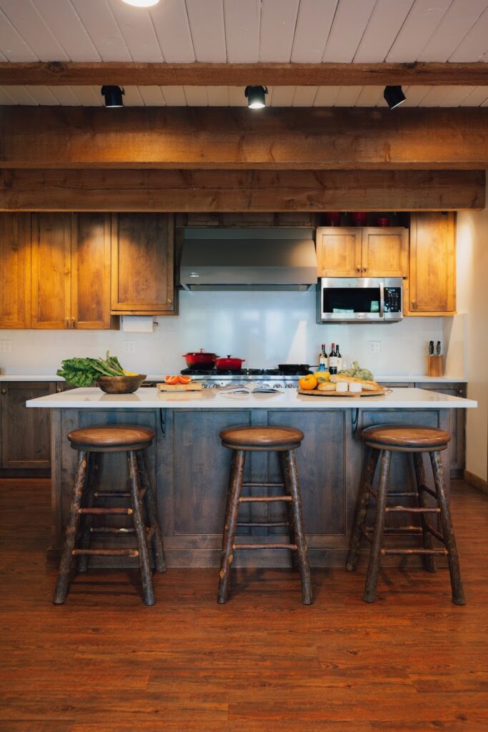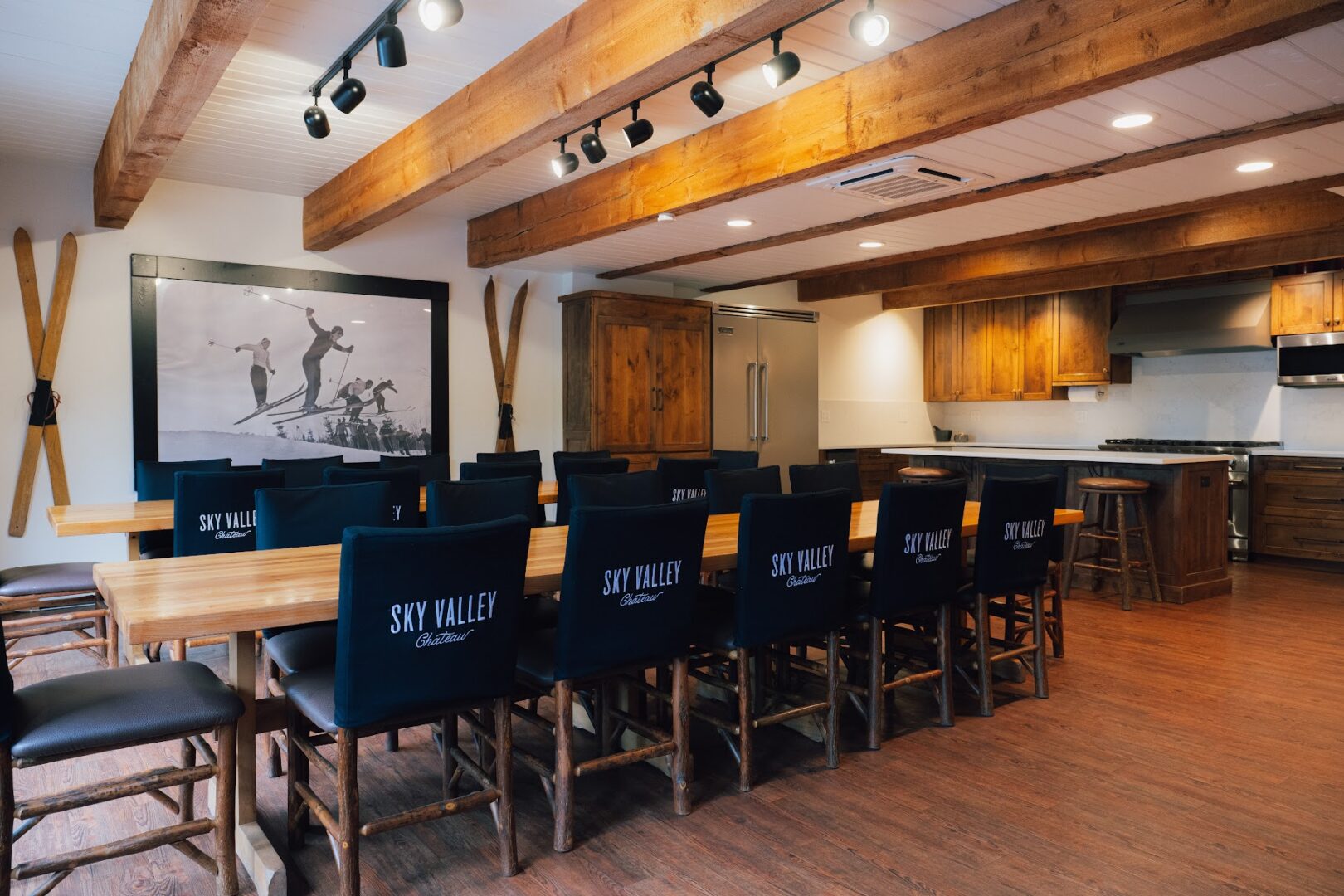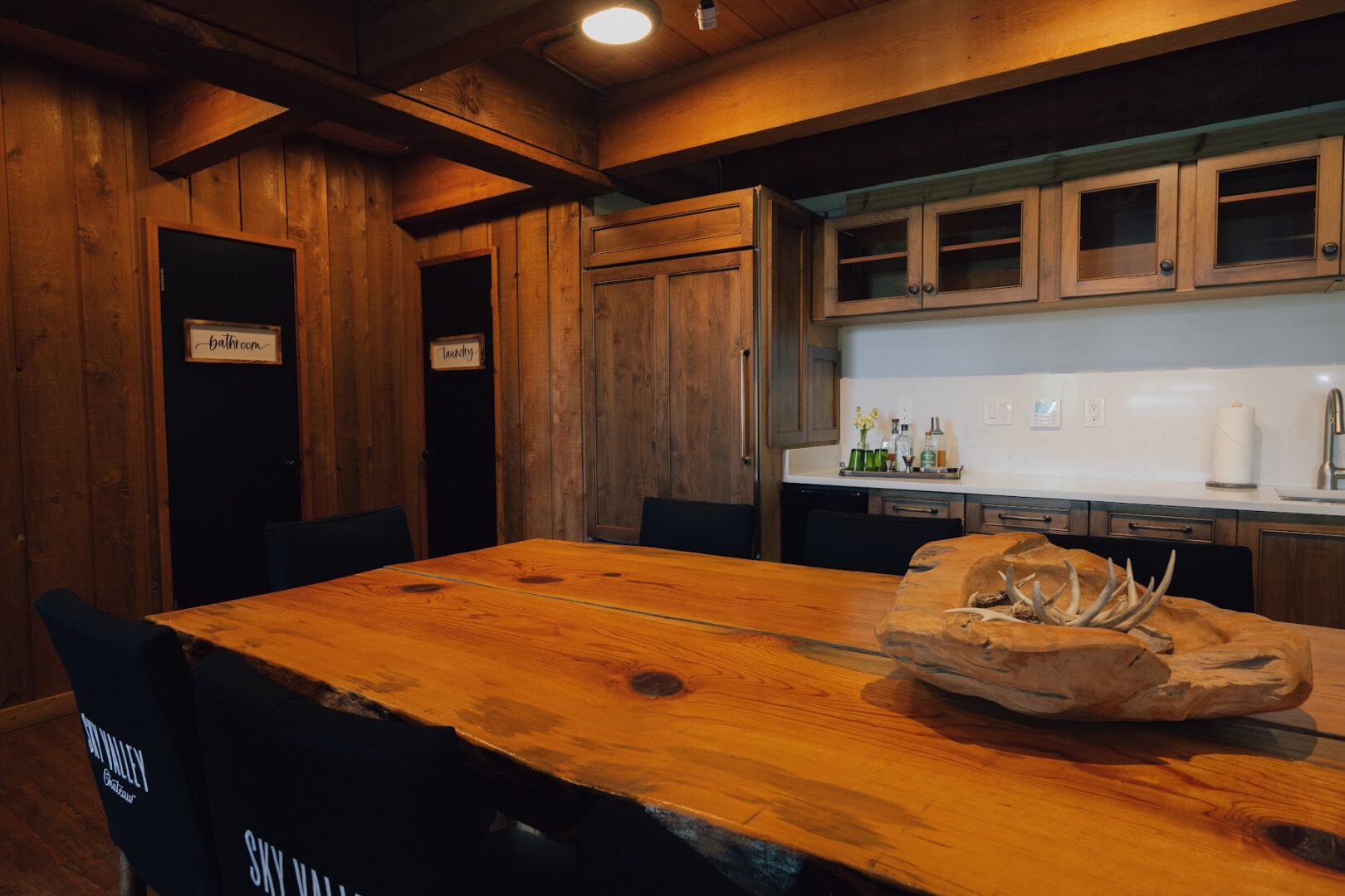 Sky Valley Chateau features a fully equipped chef’s kitchen designed to fulfill all your culinary needs. The kitchen includes a Forno range with eight burners and two ovens, a Viking 48″ refrigerator, Sub-Zero refrigerator and freezer drawers, a Miele dishwasher, and a residential-style ice machine.