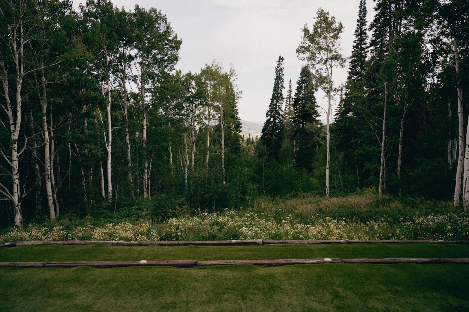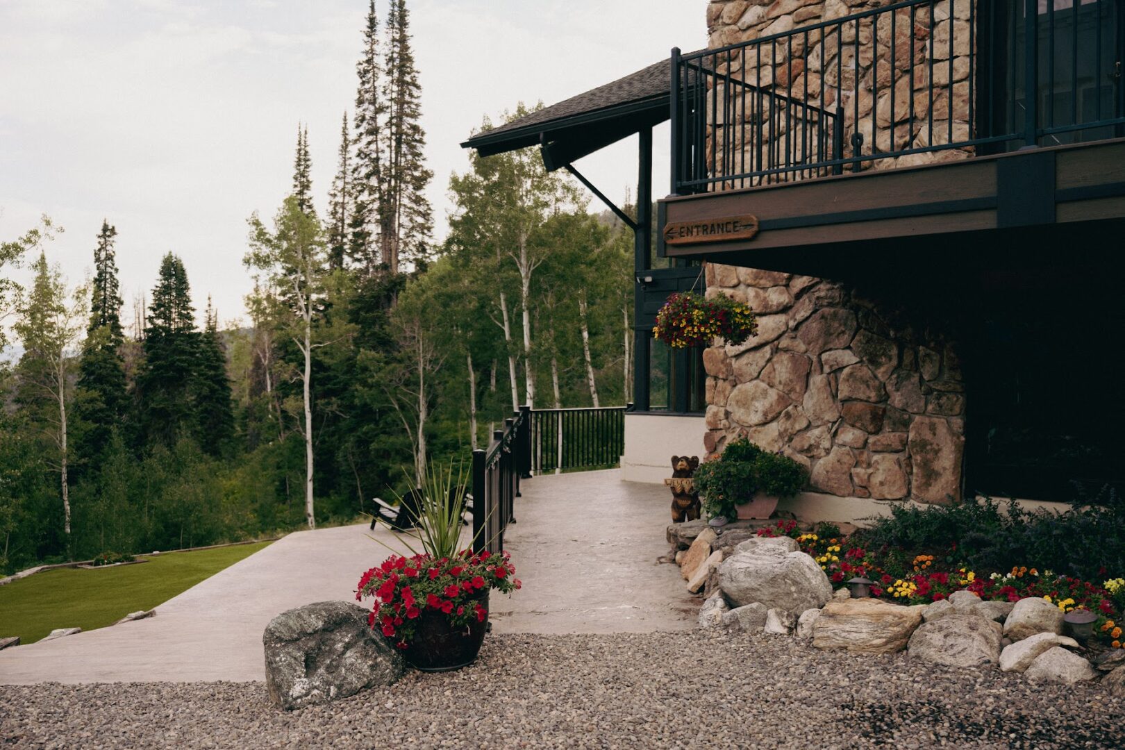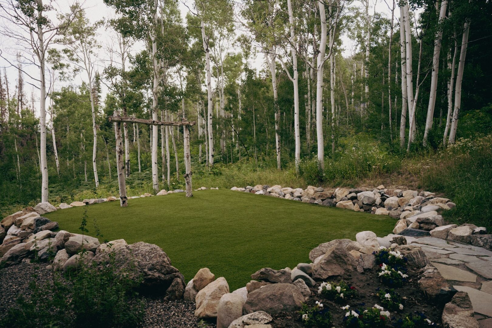 On the left side of the property, a raised, boulder-lined lawn serves as a picturesque wedding lawn, complete with a permanent aspen arch.
