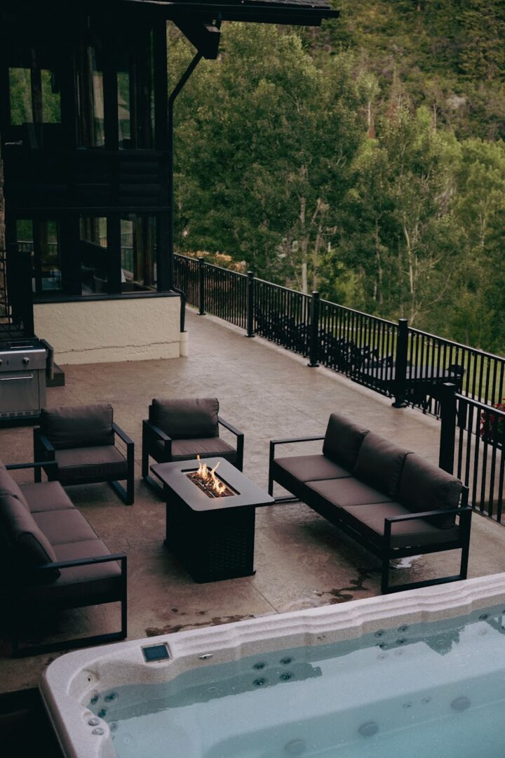 The top concrete patio is an entertainer’s dream, equipped with a propane grill, generous lounge seating, a gas fire pit, and a 16-person swim spa/hot tub, perfect for relaxing and socializing while soaking in the stunning surroundings.