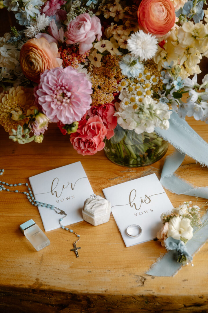 Morgan and Trent began their morning with private vows on the Chateau’s side deck, overlooking the valley as the sun lit up the hills—a grounding moment before the excitement ahead. Their ceremony featured an Irish ring blessing, where guests offered prayers and well wishes over the rings, weaving everyone into the fabric of their marriage.